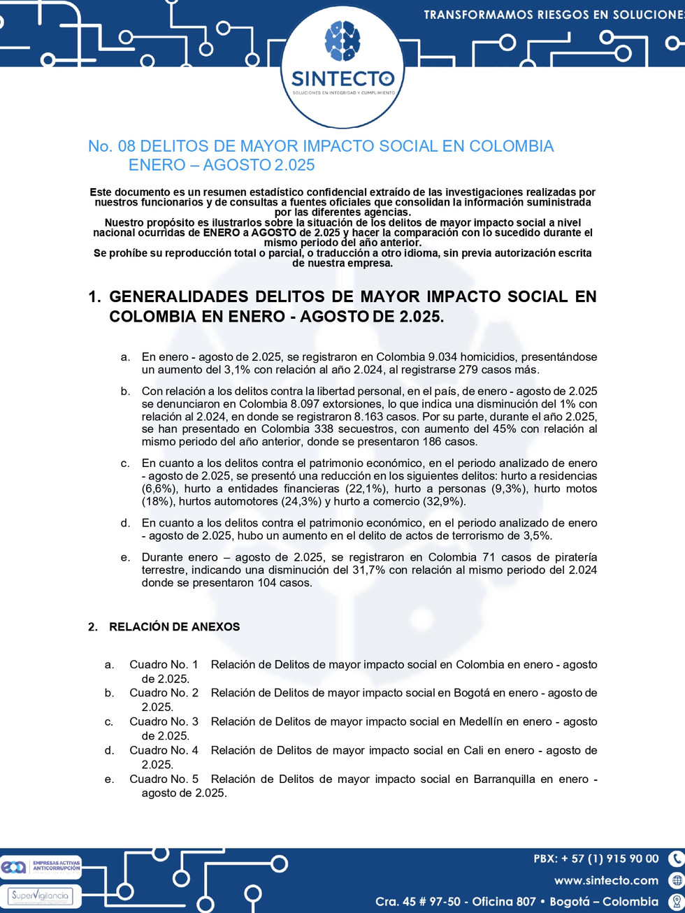 No. 08 Delitos De Mayor Impacto Social En Colombia Enero – Agosto 2.025